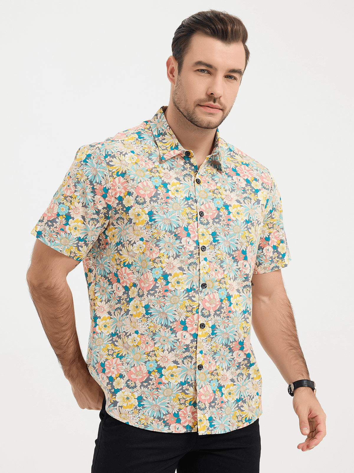 Camicia corta da uomo casual in cotone con bottoni e stampa floreale